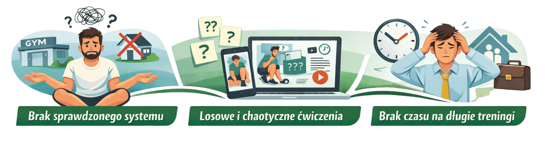 Każdy trening trwa do 20 minut. System został zaprojektowany tak, aby dało się go realizować w realnych warunkach domowych osób zapracowanych z rodziną i codziennymi obowiązkami na głowie, bez reorganizacji całego dnia.